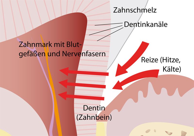 Prinzipiell kann hinter einer Überempfindlichkeit der Zähne allerdings auch eine Karies stecken, die schon tief ins Dentin hineinreicht oder eine Entzündung des sehr Schmerz empfindlichen Zahnmarks selbst.