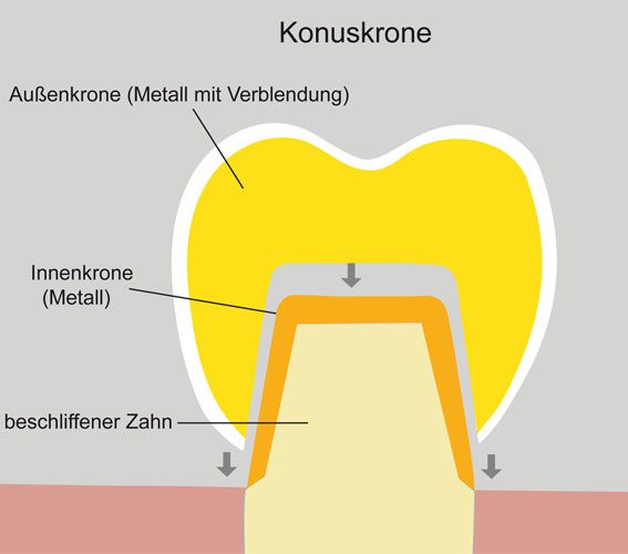 Dabei werden zwei Arten unterschieden: Konuskronen- und Teleskopkronenprothesen. Sie unterscheiden sich nur in der Form der jeweils übereinander gesteckten Kronen voneinander: Konuskronen sind konisch, sie verschmälern sich zur Kronenspitze hin. Teleskopkronen haben parallel verlaufende Außenwände, sind also zylindrisch.